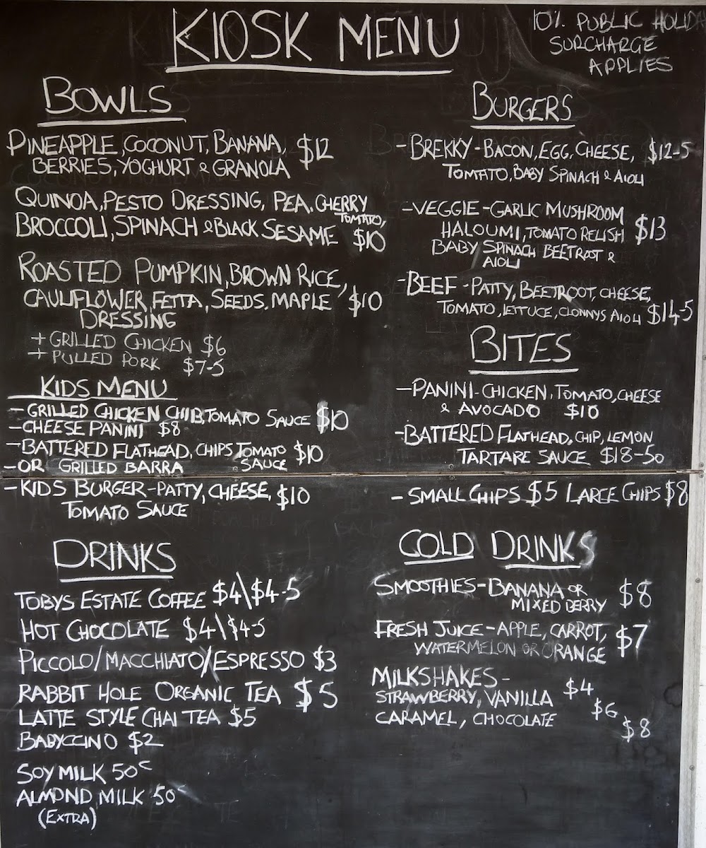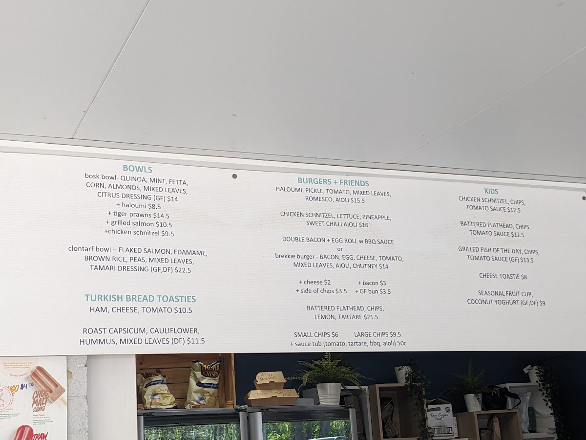Food options include light bites such as paninis and battered flathead with chips and tartare sauce. There are also bowls featuring fresh ingredients like roast capsicum, cauliflower, hummus, mixed leaves, and haloumi with romesco and aioli. Heartier items include chicken schnitzel with lettuce, pineapple, and sweet chilli aioli, as well as savory breakfast-style rolls featuring bacon and egg with BBQ sauce.